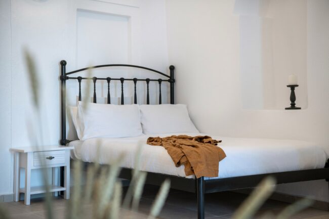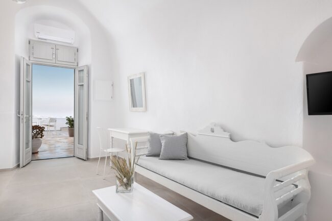 The design of the Veranda View suite is based on the typical Cycladic style, renowned for its simplicity and the sense of calm it emanates. The 50-square-meter room is carved into the rock, its design inspired by the caves deep in the cliff.